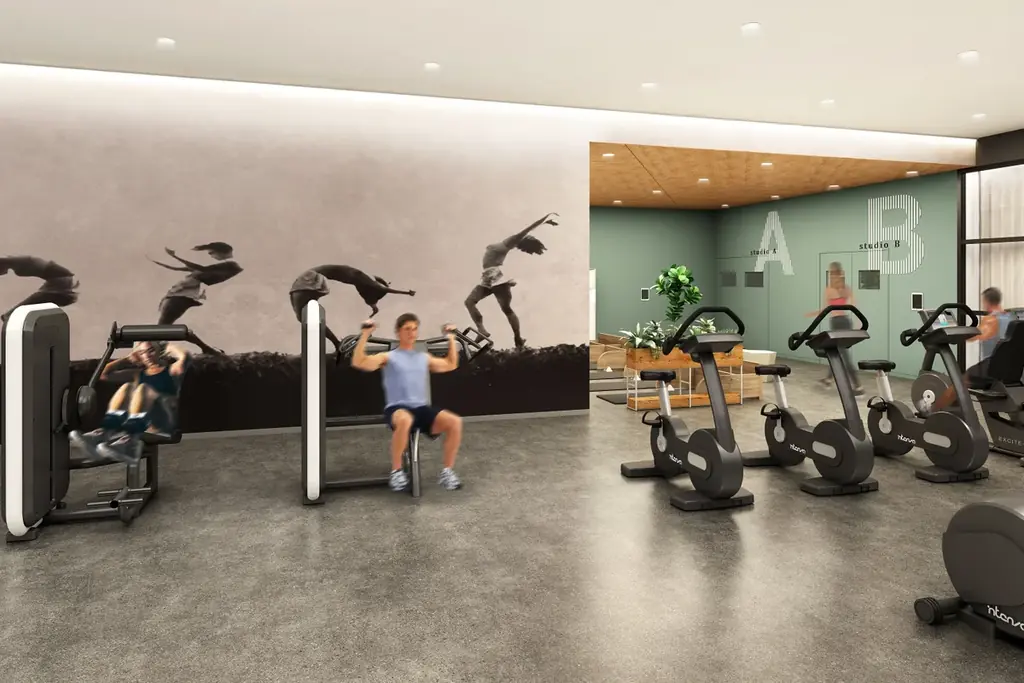 ジムは約450㎡の広さを確保し、シームレスに繋がる6つのトレーニングエリアで構成されています。パーソナルニーズに対応する半個室のパーソナルスペースやストレッチブースも備わり、集中してトレーニングに取り組める環境を用意しています。