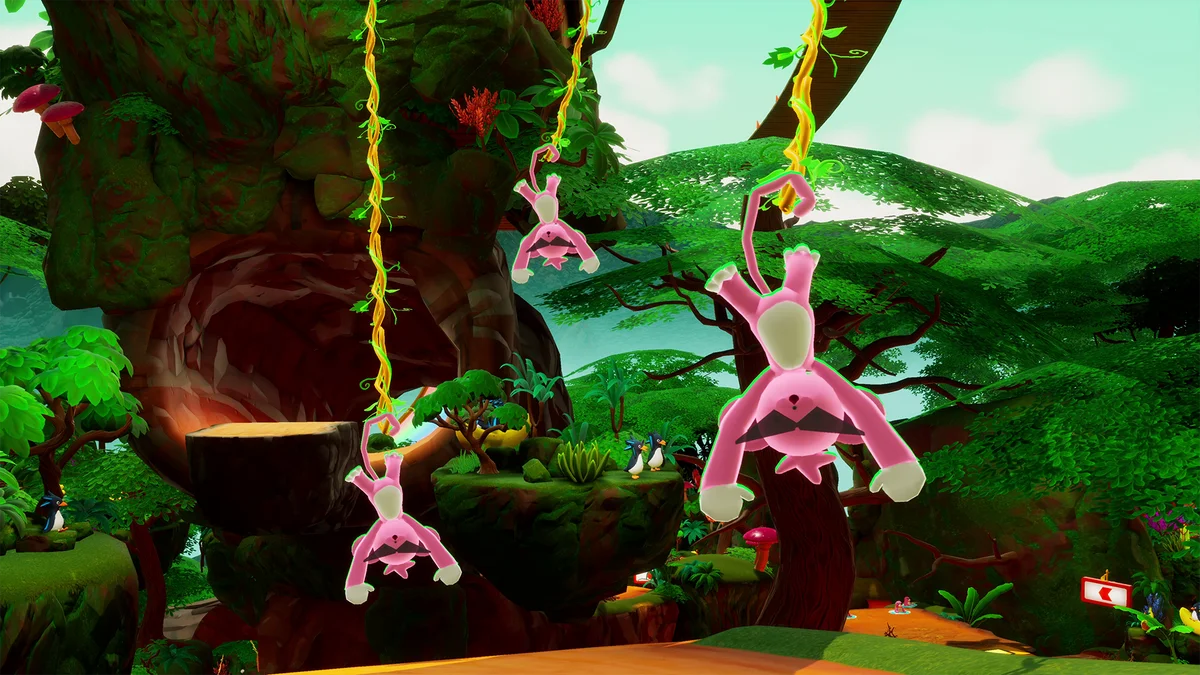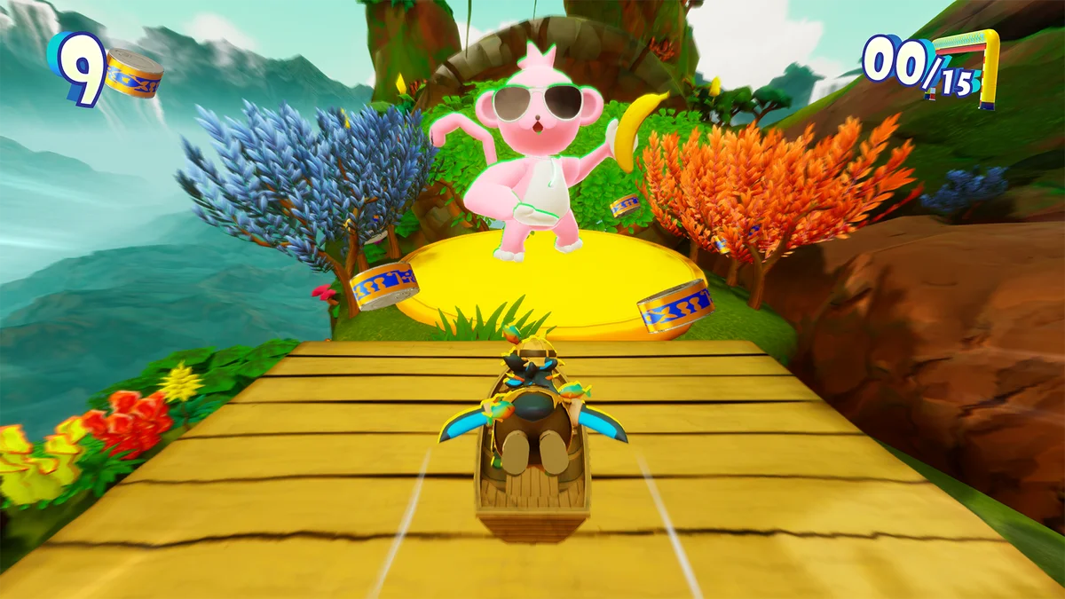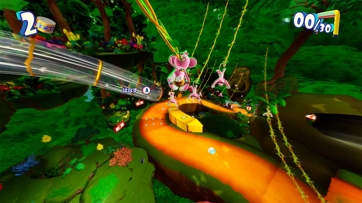 新しいギミックとして導入されるのが「モンキー」です。モンキーへアタックすることでモンキーがプレイヤーを運び、さらに運搬中にもう一度アタックボタンを押すと、狙ったタイミングで飛び出せる仕様となっています。