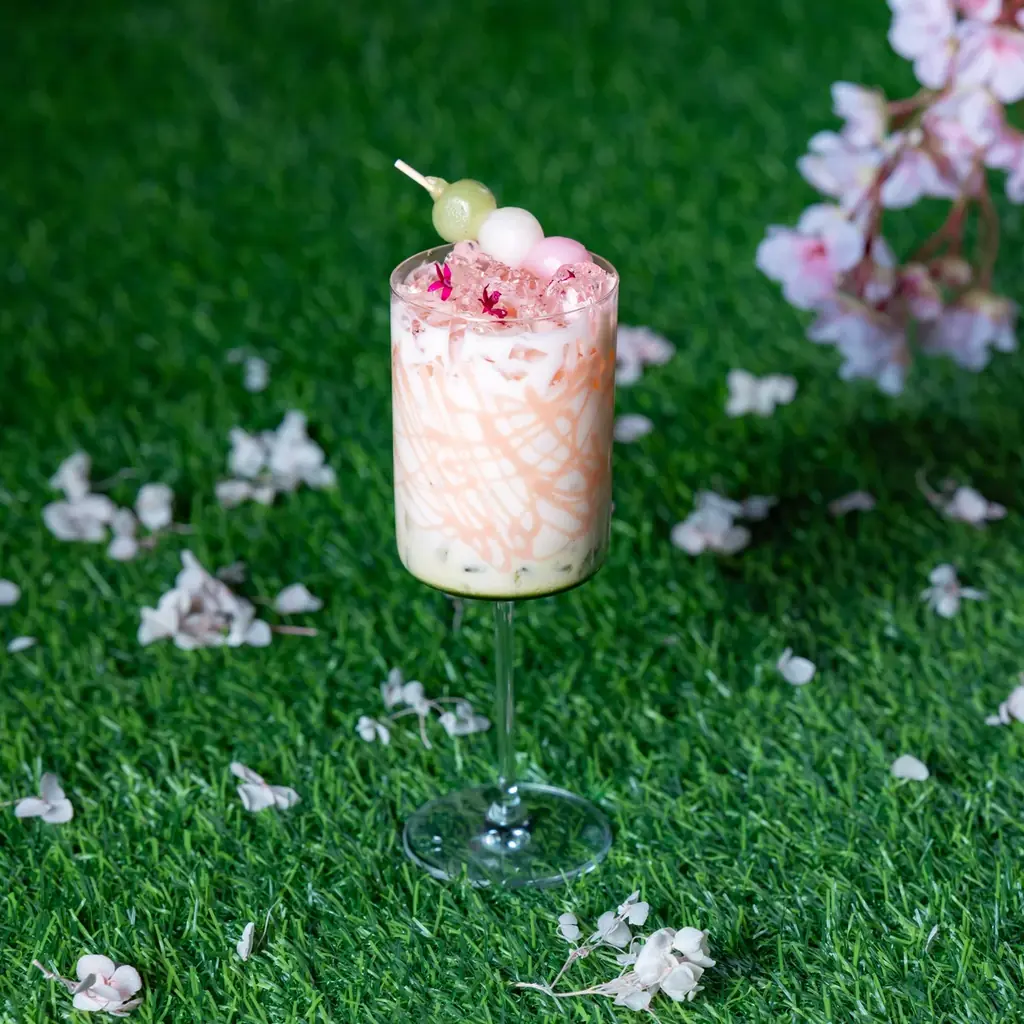 「三色団子のスムージー」は三層構造で「飲むお団子」を再現した一杯です。濃厚抹茶ミルクの層、団子と桜アイスを合わせた“もちもち・ふわとろ”の層、桜のシロップとスパークリングジュレの層という構成で、仕上げに三色団子が添えられます。