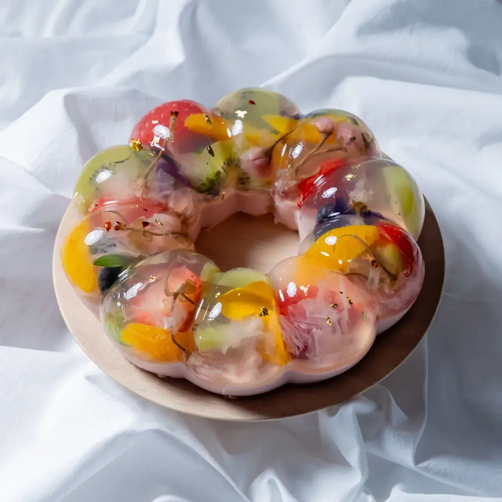 宿泊プラン限定のアニバーサリーケーキは「あまおうのババロア」をベースに桜とフルーツをゼリーに閉じ込めた「桜とあまおうのブーケケーキ」として提供されます。ケーキサイズは6号で、2名様からシェアして楽しめるサイズです。