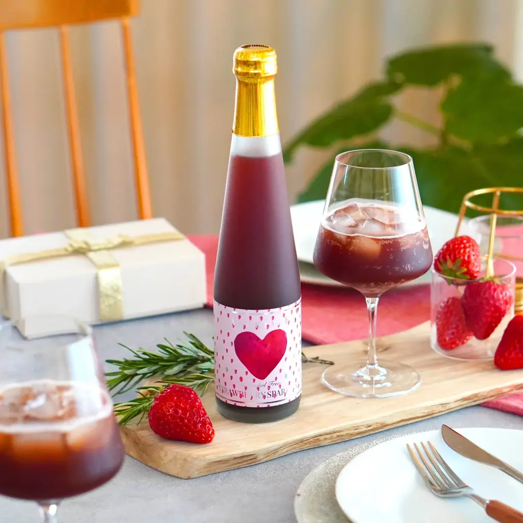 お部屋にはベジターレの『苺のノンアルコールスパークリング』を1室につき1本(300ml)ご用意します。栃木県産「とちあいか」や福岡県産「あまおう」など、国産いちごを使用した製品で、ビュッフェの余韻や客室でのリラックスタイムに合わせた演出です。