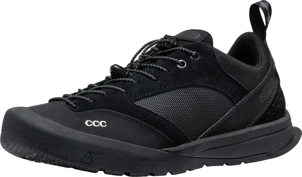 今回のコラボレーションの主役であるJASPER Ⅲ(品番:1031890 MEN)は、KEENのロングセラーJASPERコレクションをベースに、現代のクライミングシューズの要素を取り入れてアップグレードしたモデルです。デザインコンセプトは「どんな時代にもフィットするBLACKとリフレクター」。視認性の高いリフレクターを各所に配置し、着脱を容易にするバンジーレースを採用したスペシャル仕様です。