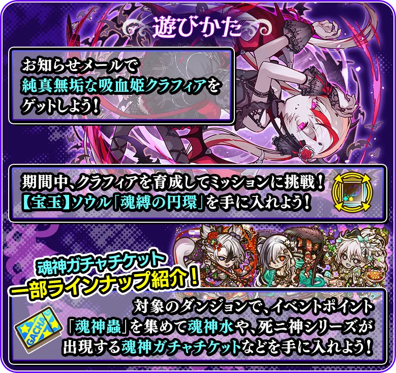 | ログインボーナス | 光結晶 最大60個(期間中毎日ログインで合計)/新キャラクター「純真無垢な吸血姫クラフィア」配布はログイン後のお知らせメールで受取 |