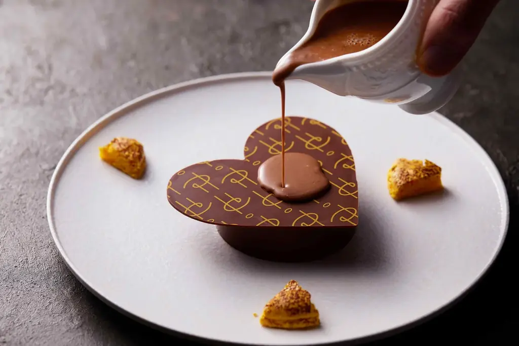 コースのデザートにはピエール・エルメ・パリの期間限定スイーツ「Coeur Mogador(クール モガドール)」が含まれます。ラグジュアリーな空間での静かなひとときを想定したコース構成です。予約はレストランの専用ページ(こちら)から可能です。