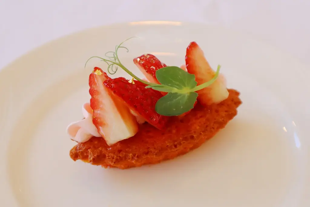 『苺のデクリネゾン』は、苺を主題にした6種類のスイーツをワンプレートで提供する構成です。甘酸っぱい苺の風味を生かしつつ、ホワイトチョコレートやピスタチオ、フランボワーズ、発酵バターなど多様な素材を組み合わせ、食感や風味のバリエーションを付与しています。