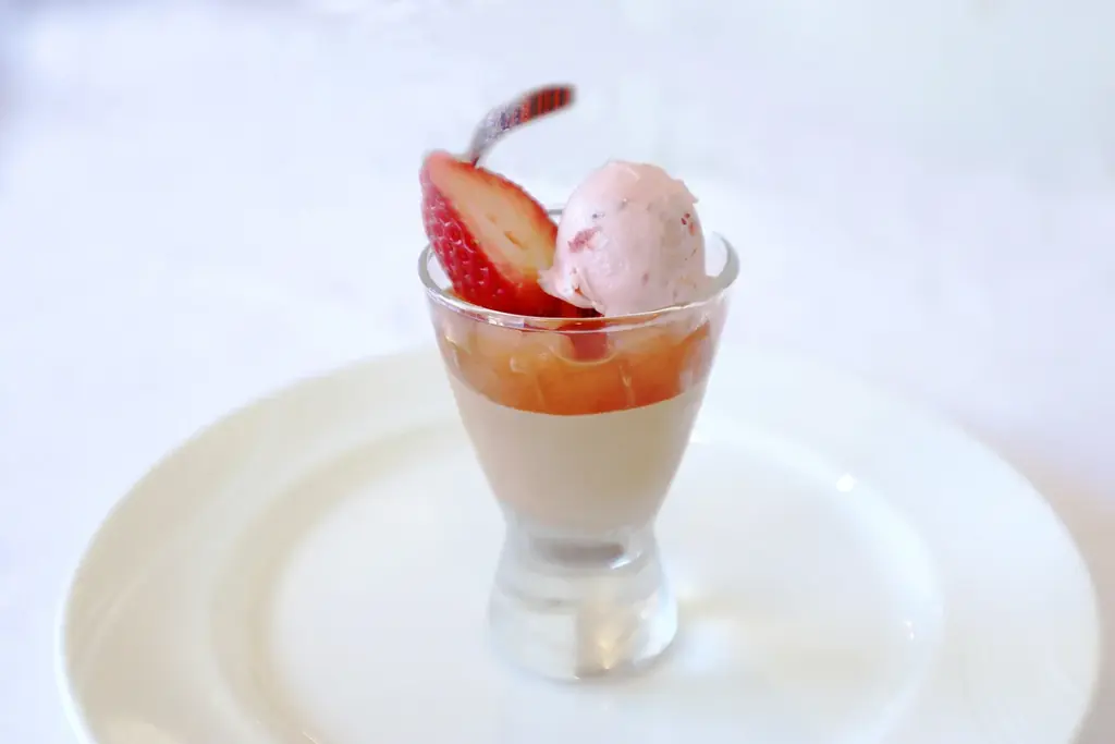 チョコレートムースの上に爽やかな苺ゼリーを重ね、その上に「まりひめ」と苺アイスクリームをトッピングしています。層ごとの温度差と口溶けの違いが特徴です。