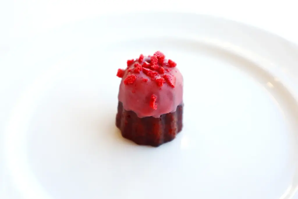 フランス産発酵バターを使用したカヌレをベースに、苺チョコレートでコーティングした一品です。伝統的なカヌレの内側のしっとり感に、苺チョコの酸味がアクセントとして寄与します。