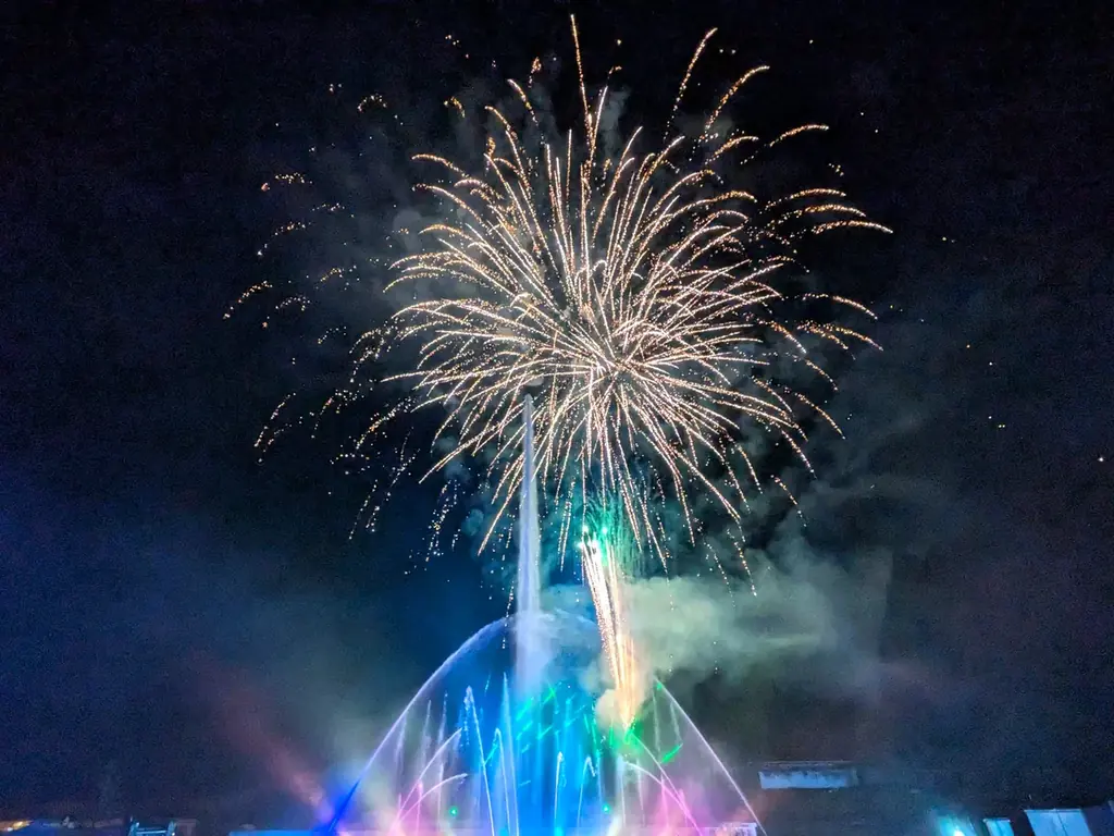 噴水は最大到達点150mを誇るダイナミックな演出です。照明とレーザーを用いた演出は水の動きと同期し、夜空に立ち上る水柱と光線が躍動的な造形を描きます。そこへ花火が重なることで、視覚的な重厚感と瞬間の高揚を生む構成になっています。