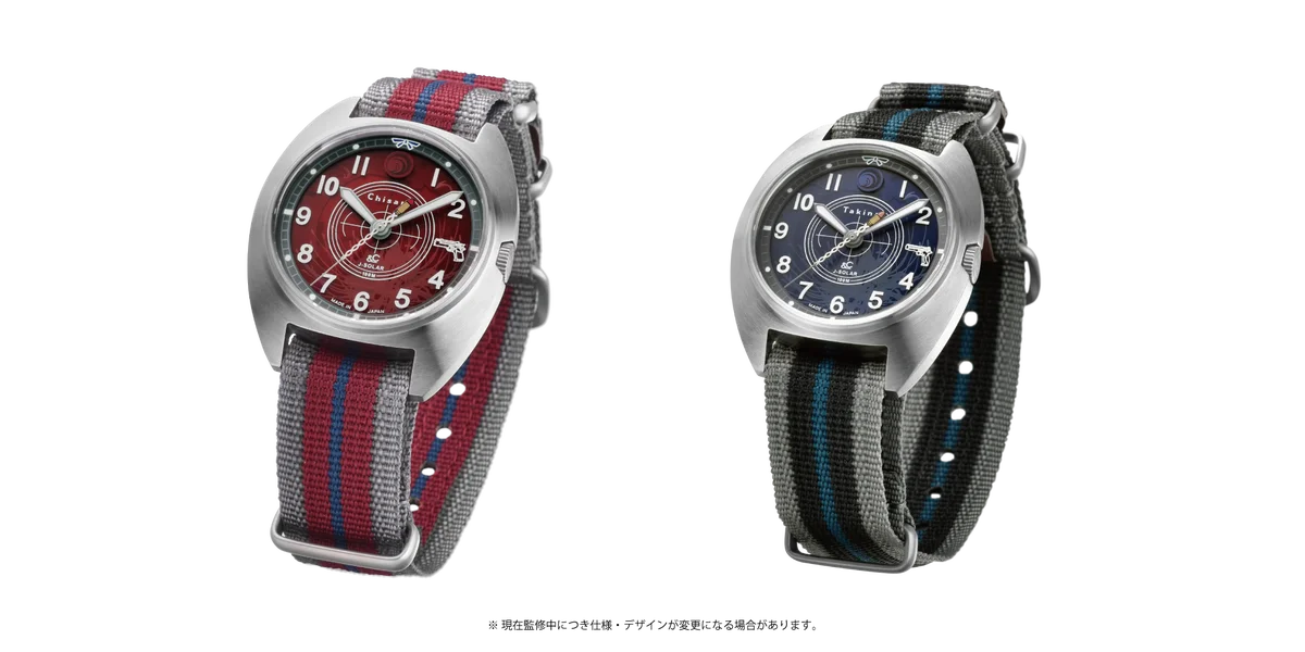 今回のコラボレーションでは、錦木千束(Chisato)モデルと井ノ上たきな(Takina)モデルの2種類が用意され、それぞれ限定300本ずつの生産となる。文字盤や秒針、裏蓋の刻印などにキャラクター要素が随所に取り入れられている。