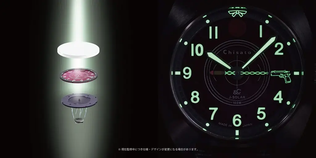 文字盤の3時位置には千束の銃のシルエットが配され、視覚的なアクセントとなっている。裏蓋には「DA」と「Chisato」の刻印に加え、限定300本のシリアルナンバーが刻まれる。
