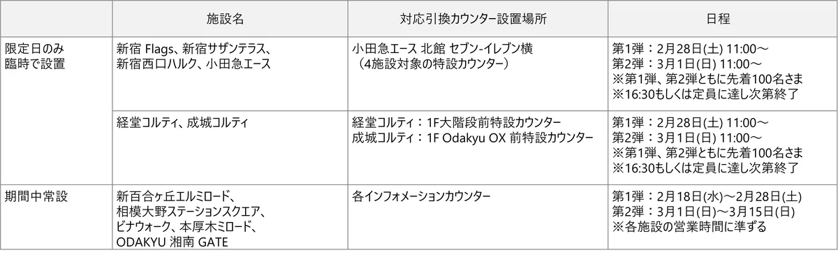 対象施設は新宿 Flags、新宿サザンテラス、新宿西口ハルク、小田急エース、経堂コルティ、成城コルティ、新百合ヶ丘エルミロード、相模大野ステーションスクエア、ビナウォーク、本厚木ミロード、ODAKYU 湘南 GATEの11施設です。施設によっては一部の企画・ノベルティや販売期間が限定されています。