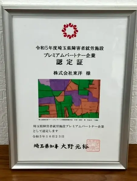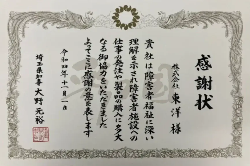 株式会社東洋は、行田店での継続的な福祉施設支援の取り組みと実績が評価され、以下の認定や感謝状を受けています。令和4年(西暦2022年)11月1日には「障害者就労施設応援企業」に認定され、感謝状が授与されました。