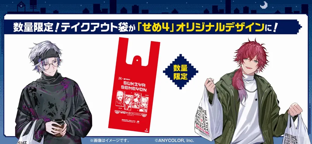 また、池袋サンシャイン前店(東京都)と堺筋恵美須町店(大阪府)の2店舗では、期間中(2月5日AM9:00~3月18日)の特別装飾が施されます。テイクアウト利用者にはコラボ限定デザインのテイクアウト袋での提供も行われますが、商品の内容や量により通常の袋で提供される場合があり、袋のみの単体配布は行いません。テイクアウト袋も無くなり次第終了となります。