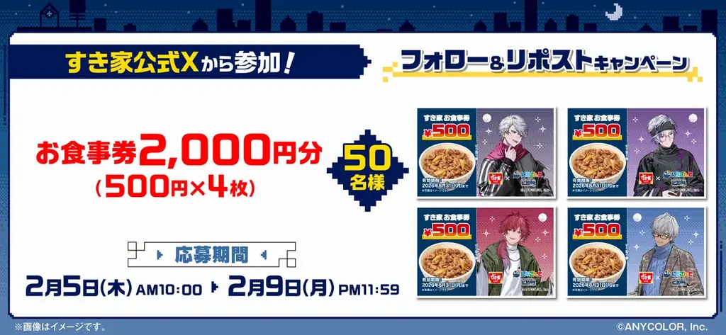 すき家公式X(@sukiya_jp)をフォローし、対象ポストをリポストすることで抽選に参加できます。当選者にはオリジナルデザインのお食事券2,000円分(500円×4枚)が進呈され、当選者数は50名です。