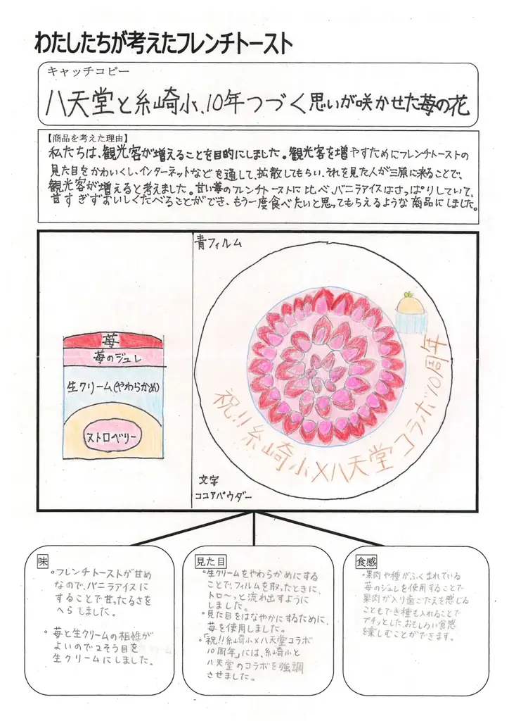 その結果、グランプリに選ばれた案『八天堂と糸崎小、10年つづく思いが咲かせた苺の花』は商品化され『苺のフレンチトースト』として提供されます。準グランプリの『大人も子供も楽しめる三原だるまフレンチトースト』は『三原だるまフレンチトースト』として採用されます。