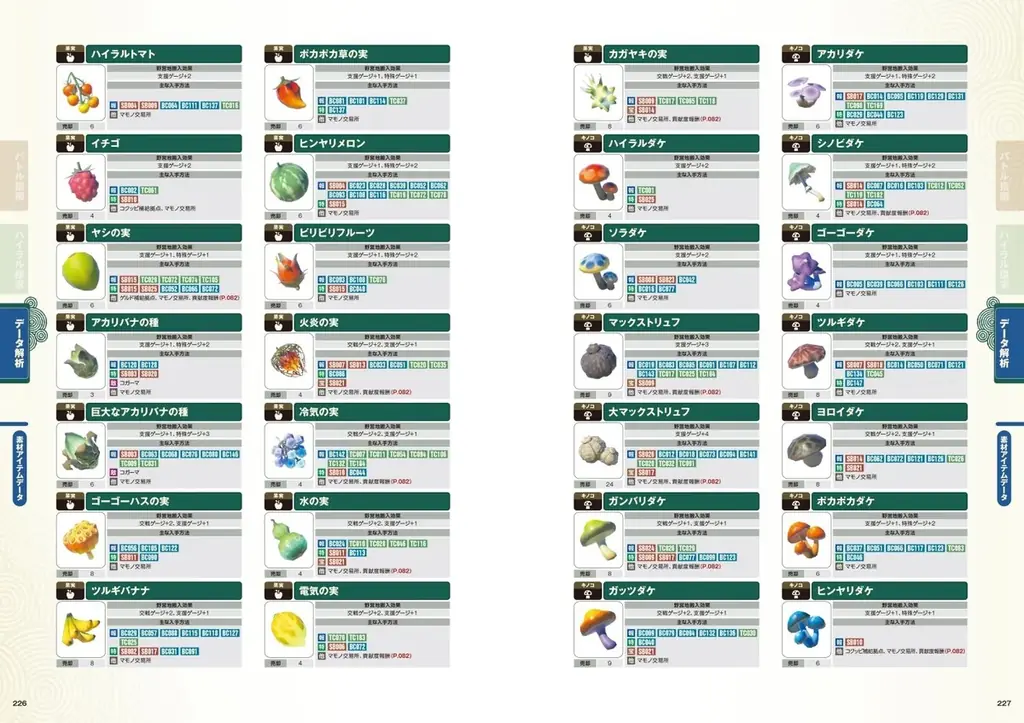 データ解析パートは、武器の強化データや補給拠点、魔物交易所で販売される全商品リストなど、運用面で必要となる「数値」と「商品情報」を一覧にしています。装備強化の必要素材やコスト、入手経路も合わせて記載されているため、計画的な強化が立てやすくなっています。