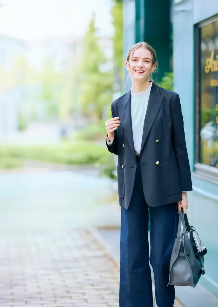 シルエットはほどよいゆとりを持たせ、ヒップにかかる丈感でバランス良く設計されています。マニッシュな印象ながら大人女性のスタイルアップを意識した仕立てで、カジュアルからきれいめまで幅広いコーディネートに合わせやすい一着です。