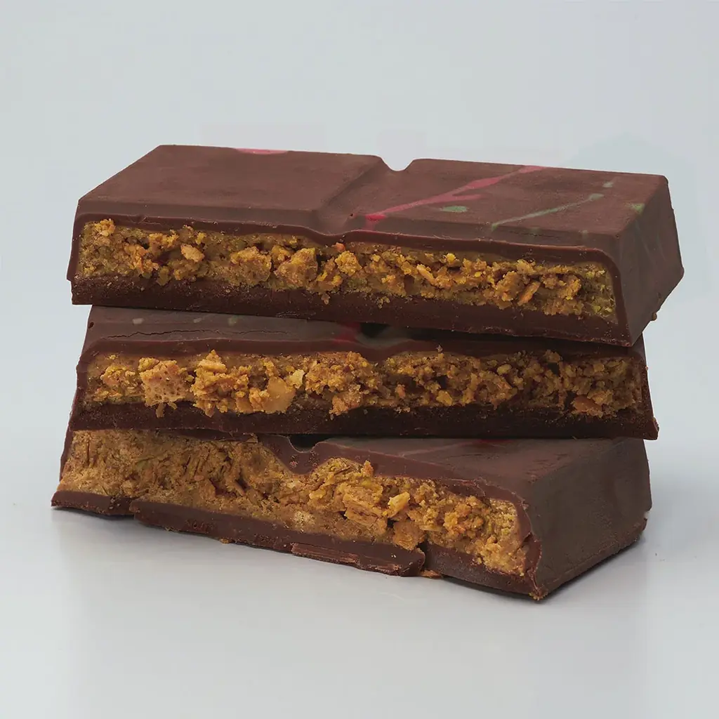 なめらかなミルクチョコレートの中にピスタチオプラリネとフィヤンティーヌをたっぷり詰めた、ドバイスタイルの贅沢なチョコレート。価格:5,400円(1箱、140g)。<日本初登場> - レ・トロワ・ショコラ パリ — スマイルセレクション