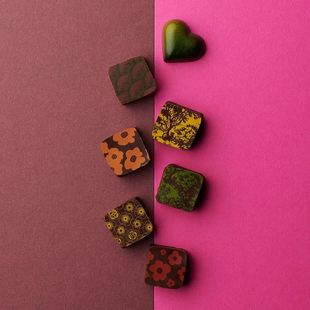 2017年にパリのマレ地区で日本人女性が開いたショコラ専門店ブランドによる、香り立つハーブとチョコレートの調和を楽しめる7個入。価格:4,104円(1箱、7個入)。<西武・そごう限定品> - エドワート — プラリネ 4個箱