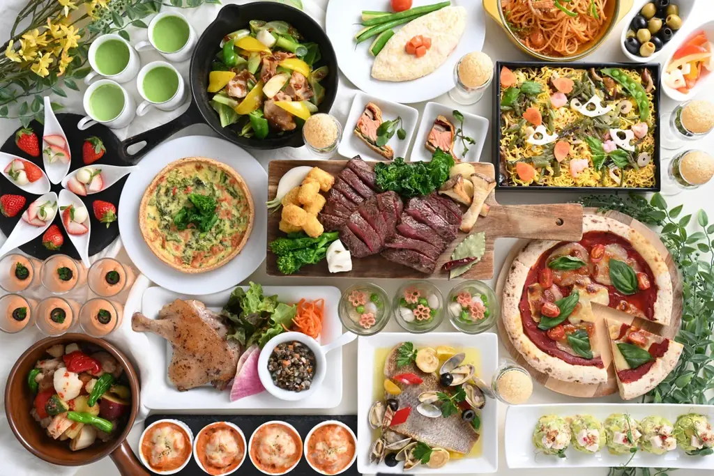 ライブキッチンでは「牛肉の鉄板焼き」や「マルゲリータピザ」、「サーモン入りホワイトオムレツ」などを実演で提供します。時間帯や曜日によって提供されるメニューが異なる点も特徴で、ディナーのみ提供の料理や土日祝ディナー限定のメニューがあります。