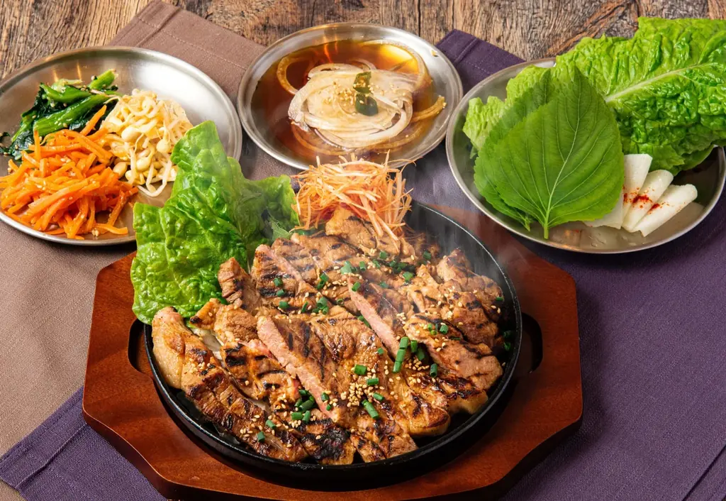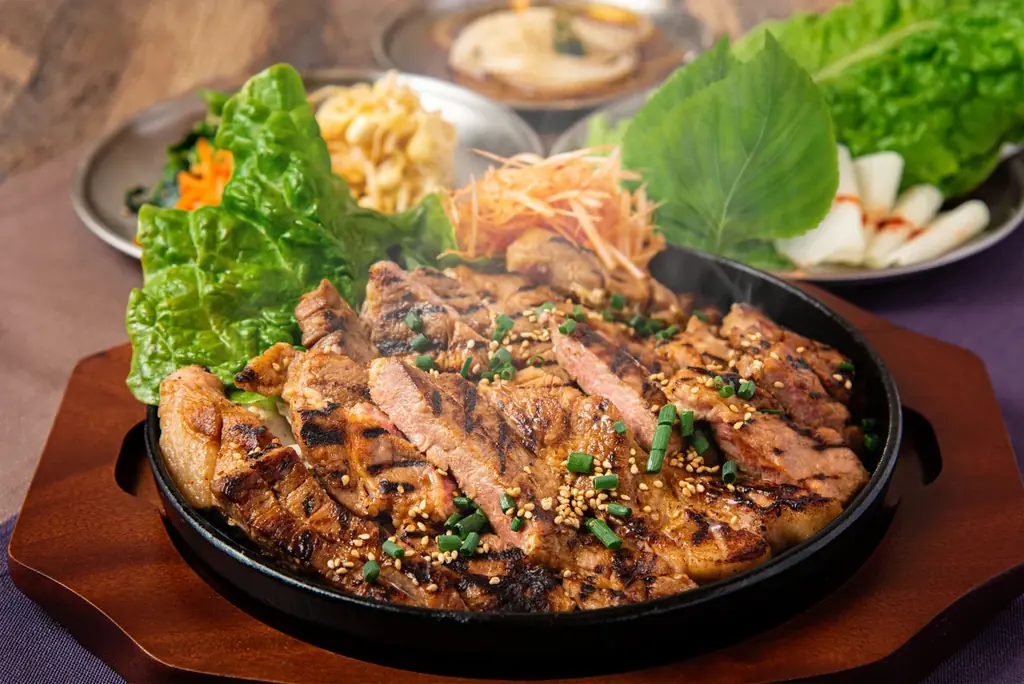 特に推奨される食べ方は、エゴマの葉やサンチュに肉と副菜を包んで食べる方法です。大根や玉ねぎ、唐辛子を酢や醤油などで漬け込んだ「チャンアチ(짱아찌)」を一緒に味わうことで、甘ダレがしみ込んだ豚肉に酸味と歯切れの良さが加わり、最後まで飽きずに食べ進めることができます。