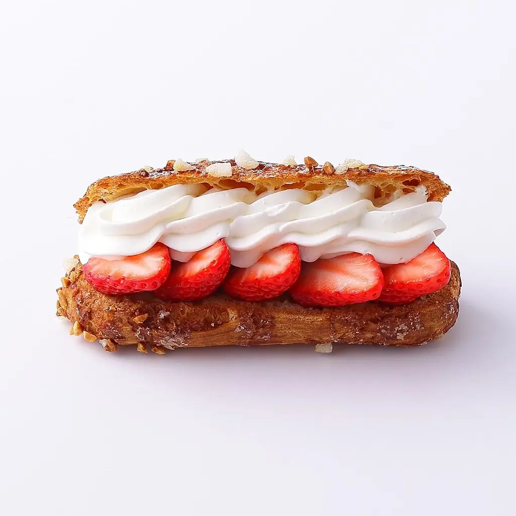- エクレア生地、煎りアーモンドチップ、クリスタルシュガー、イチゴ、クレームパティシエール、クレームシャンティ