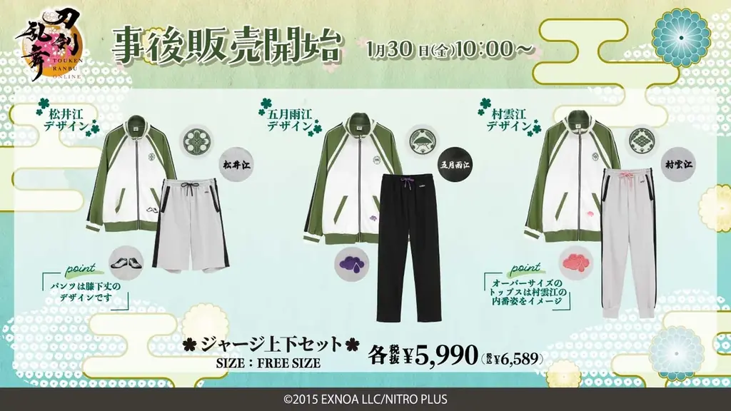 ジャージ上下セットはフリーサイズで、キャラクターモチーフをさりげなく取り入れたデザインが中心です。室内でのリラックス用途のほか、イベントや移動時のアウターとしても想定されています。