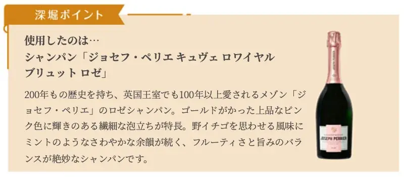 商品は生チョコレートの層とシャンパン風味のソースを重ね、シャンパングラスをイメージしたカップに収めた2層仕立てです。ロゼシャンパン(ジョセフ・ぺリエ)の甘いフルーツ風味や花の香りを生かしたソースと、ブランデー(マールドシャンパーニュ)で風味付けした生チョコレートを組み合わせています。