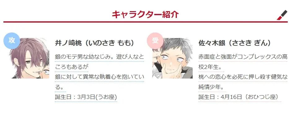 - 幼なじみで親友だった銀と桃。赤面症と目つきのせいで孤立しがちだった銀は、チャラいが人気者でモテる桃に「かわいい、俺の色になったみたいで。」と抱きしめられ恋心を自覚する。しかし、自分が桃と一緒にいると迷惑をかけてしまうと感じるようになり距離を置く銀。だが高校二年のある日、桃の告白される現場に居合わせてしまう。その日を境に、桃に絡まれ翻弄される日々が始まる――。青春×両片思いのもどかしさにときめく幼馴染BL。