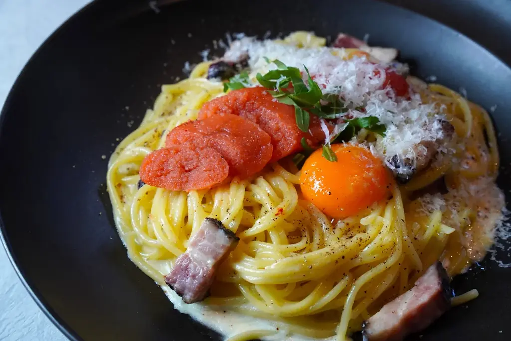 今回の新作では上記の工程に「瞬間燻製した博多産明太子」を組み合わせることで、通常のカルボナーラとは異なる風味の重層化を図っている。