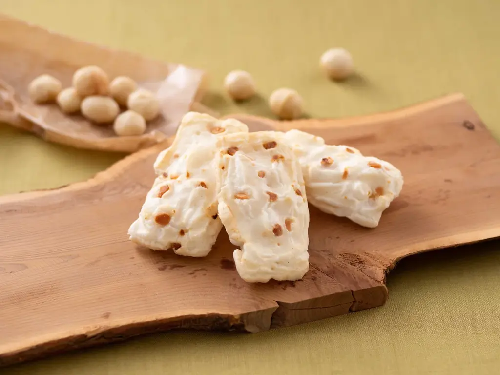 2種類のもち生地を別々に作る工程や、精米直後のもち生地加工によって、もち米本来の香りが活きた風味に仕上がっています。生のマカダミアナッツを練り込むことで、ほのかな甘みとコクのある香ばしさが加わっています。塩味はあっさりとしており、飽きのこない味わいが特徴です。