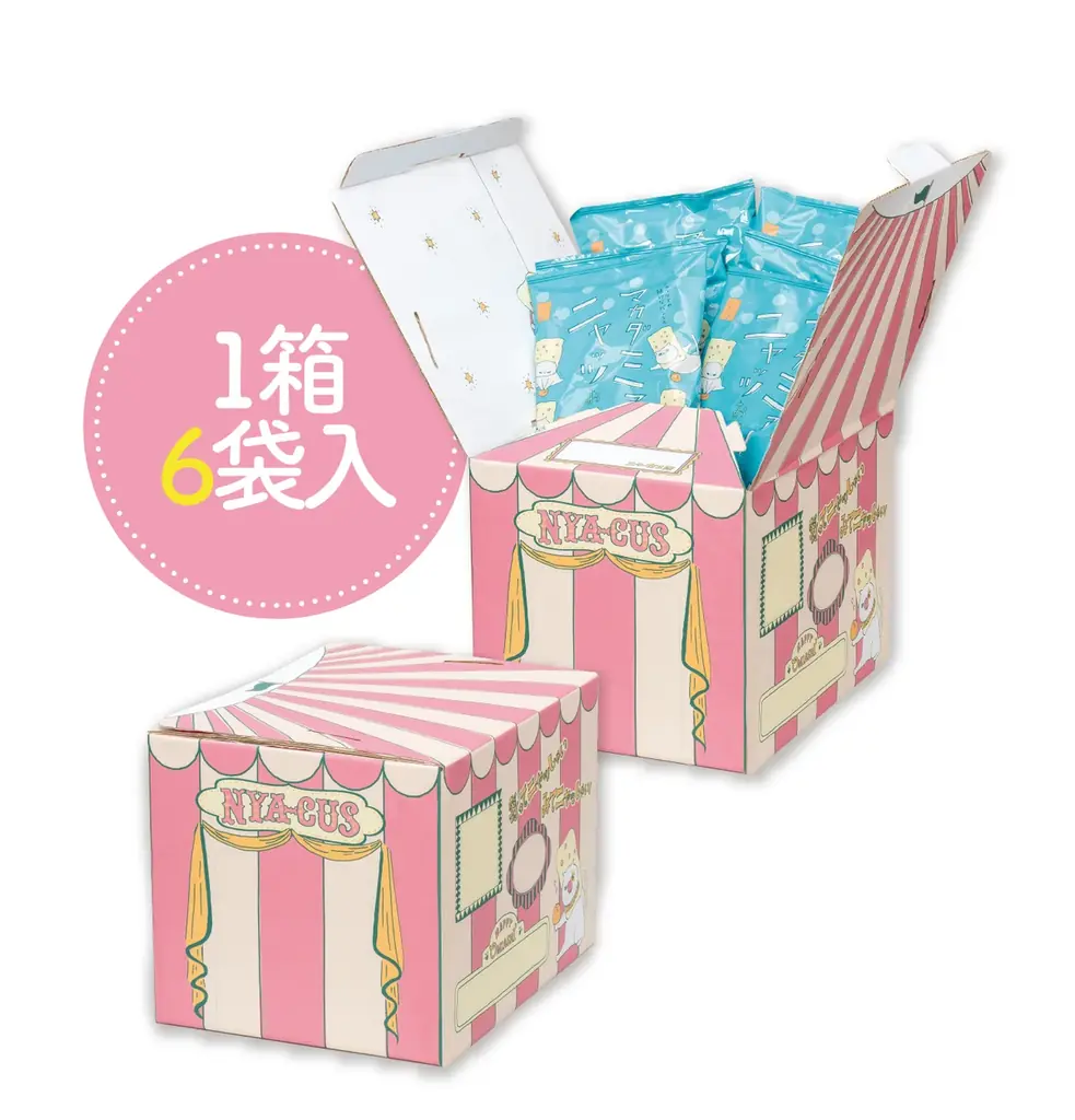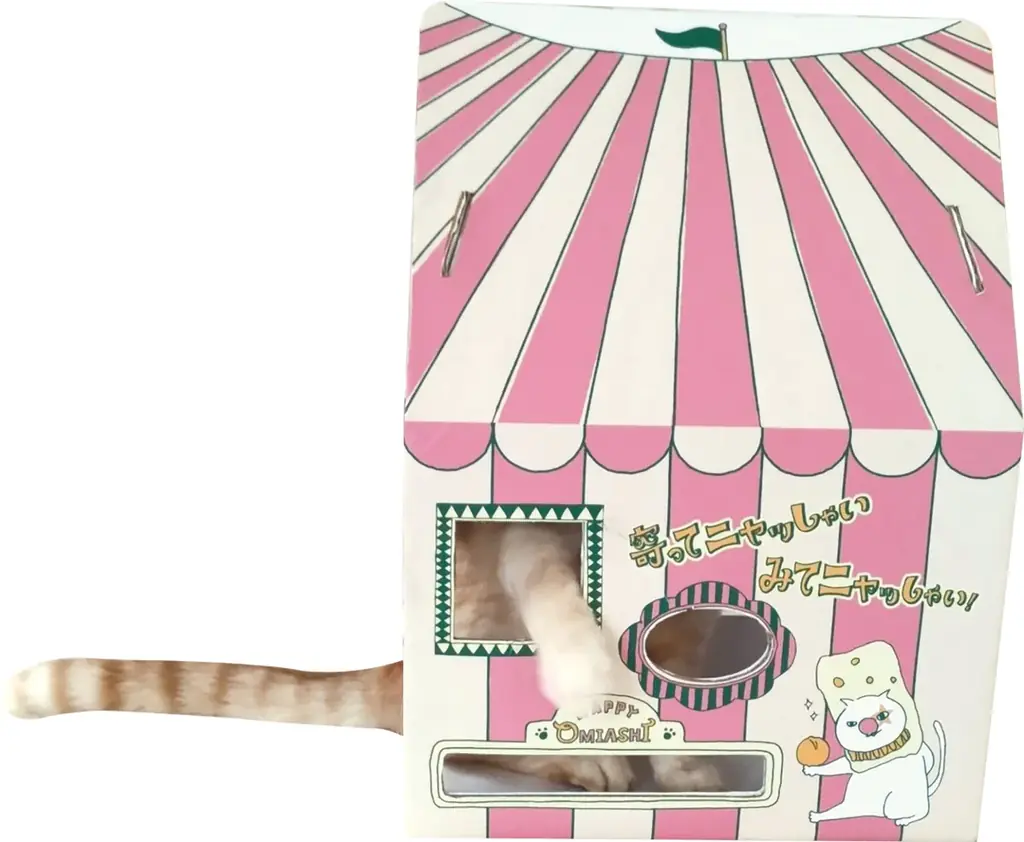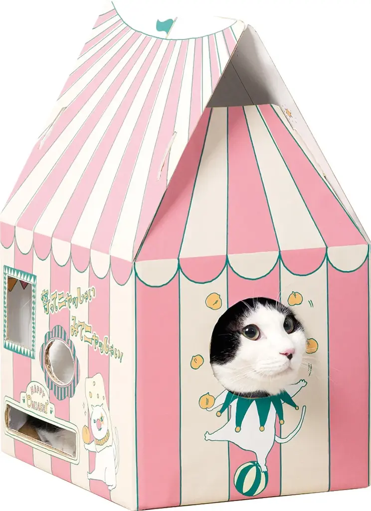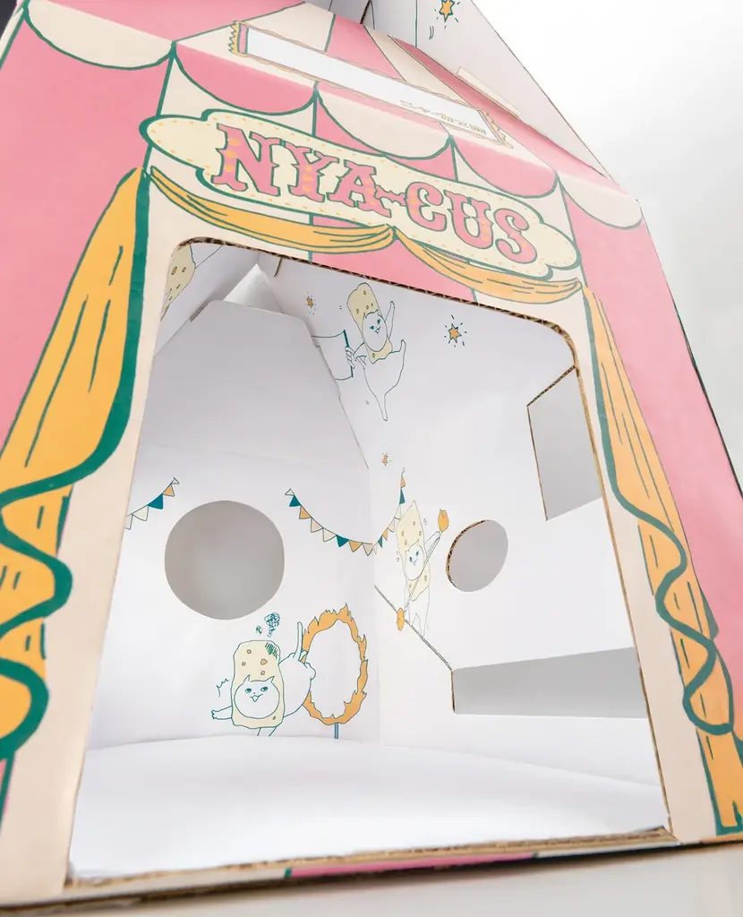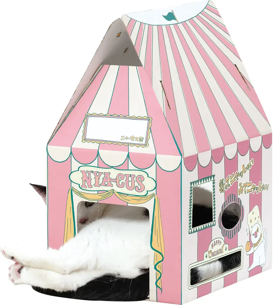 『マカダミアニャッツBOX』は単なるお菓子の詰め合わせ箱ではなく、組み立てることで幅25センチ、高さ44センチのサーカステントになる設計です。ネコが出入りしやすい「ゆったりサイズの出入口」や、手足を出して遊べる小窓、家族の様子が見える大きな窓など、観察と遊びの両方に配慮した構造になっています。