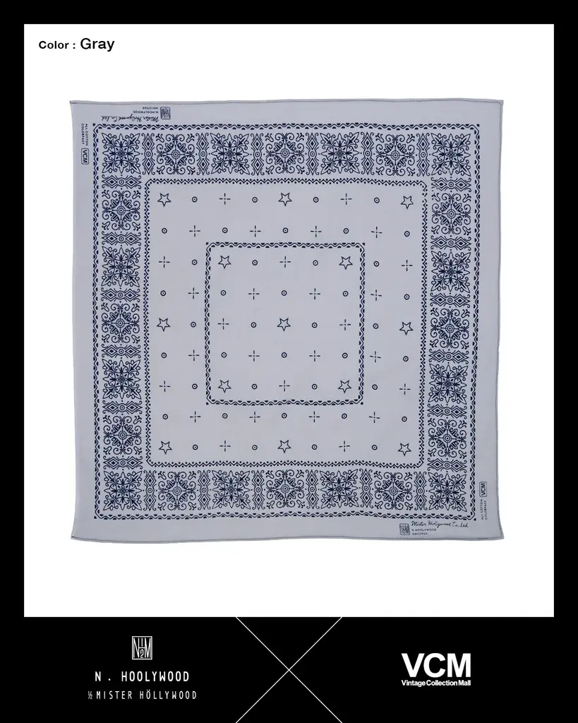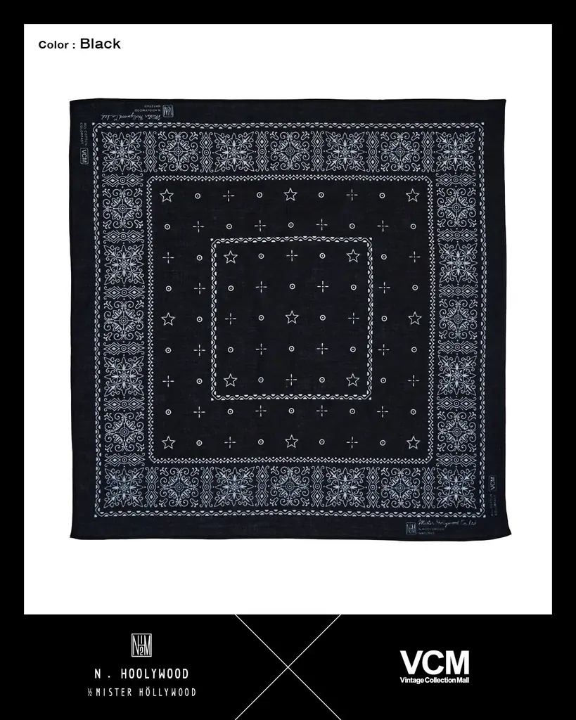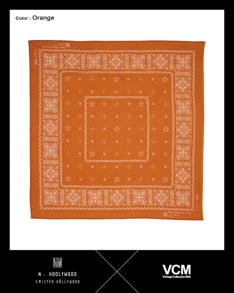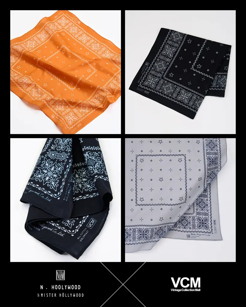今回はスペシャルコラボレーション企画として、デザイナー尾花大輔氏が手がけるブランド N.HOOLYWOOD とVCMの共同制作によるオリジナルバンダナ(全3色:Black / Orange / Gray)が制作されます。ヴィンテージバンダナの風合いや色味に着想を得たデザインで、数量限定の配布となります。