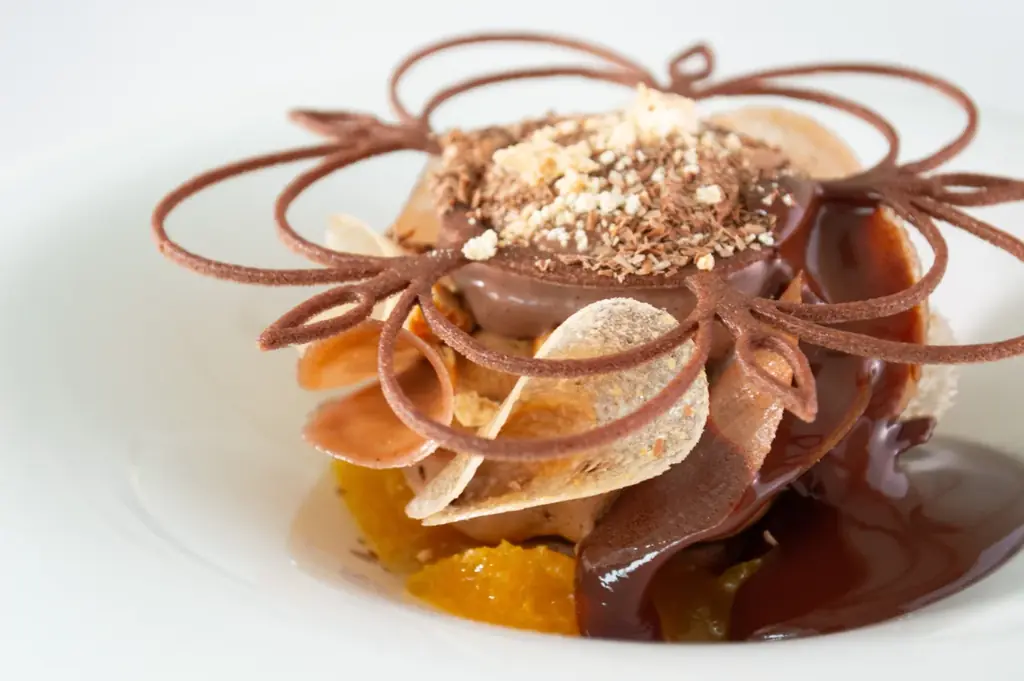 籏シェフが設計したデザートは、チョコレートの“濃厚さ”とデコポンや柚子コンフィの“爽やかな酸味”を対比させ、さらにナッツの香ばしさと食感を加えることで複層的な味覚を生み出しています。キャラメルアイスクリームにはバニラを贅沢に配合し、泡(ムース)にはオレンジリキュールを少量加えて香りの余韻を演出します。