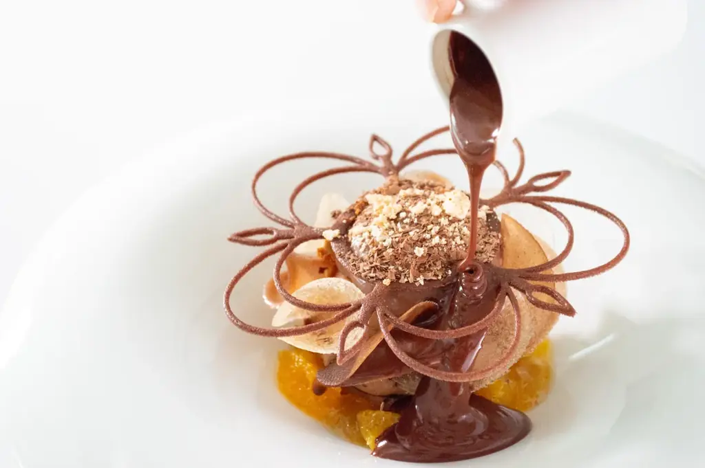 見た目の演出にも配慮があり、薄い飴チップの「オパリーヌ」やシガレット(クッキー生地)をあしらい、提供時には濃厚なチョコソースをかけてスプーンで崩しながら食べる形式です。温度差、香り、食感の違いが一度に楽しめる設計となっています。