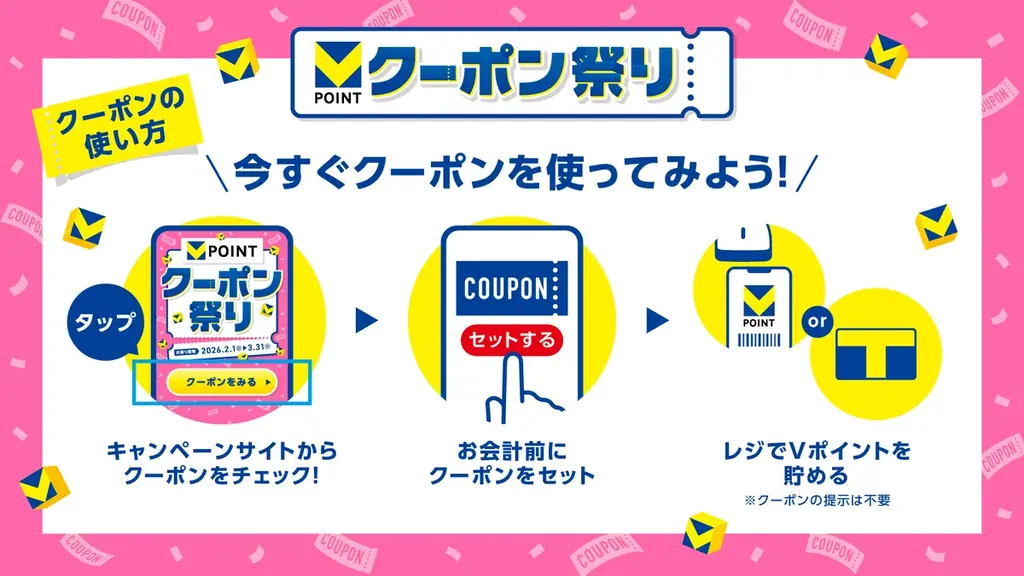 CCCMKホールディングス株式会社は、2026年2月1日(日)から3月31日(火)までの2カ月間、Vポイントがお得に貯まる「クーポン祭り」を開催します。キャンペーンの告知ページはhttps://vpoint.net/vc2で確認でき、VポイントアプリやVポイントサイトから対象クーポンを事前にセットしておくことで、対象店舗利用時に自動的に特典が付与されます。
