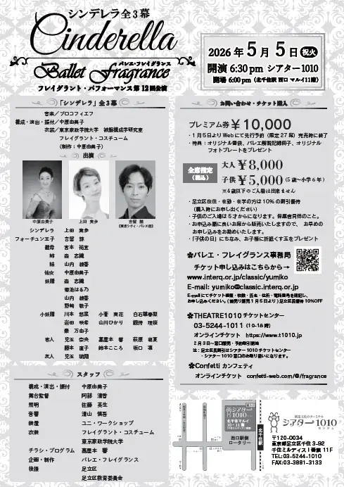 バレエ・フレイグランス(主宰:中原由美子)による『フレイグラント・パフォーマンス第12回公演「シンデレラ」全3幕』が、2026年5月5日(火・祝)にシアター1010(東京都足立区千住3丁目92 北千住駅西口 マルイ11階)で上演されます。本公演は18:00開場/18:30開演、上演時間は約2時間を予定しています。