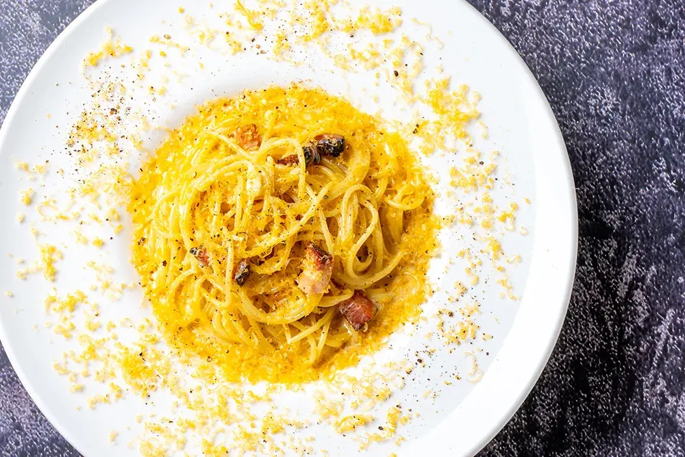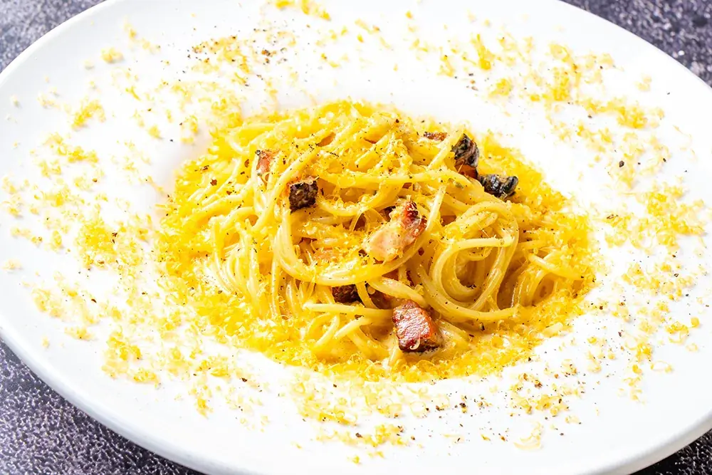 ミア・ボッカで人気No.1のパスタメニューであるカルボナーラを、北海道産チーズ4種で仕立てた〈クワトロチーズ仕立てのカルボナーラ〉です。仕上げにミモレットチーズを削り、香りと彩りを加えています。