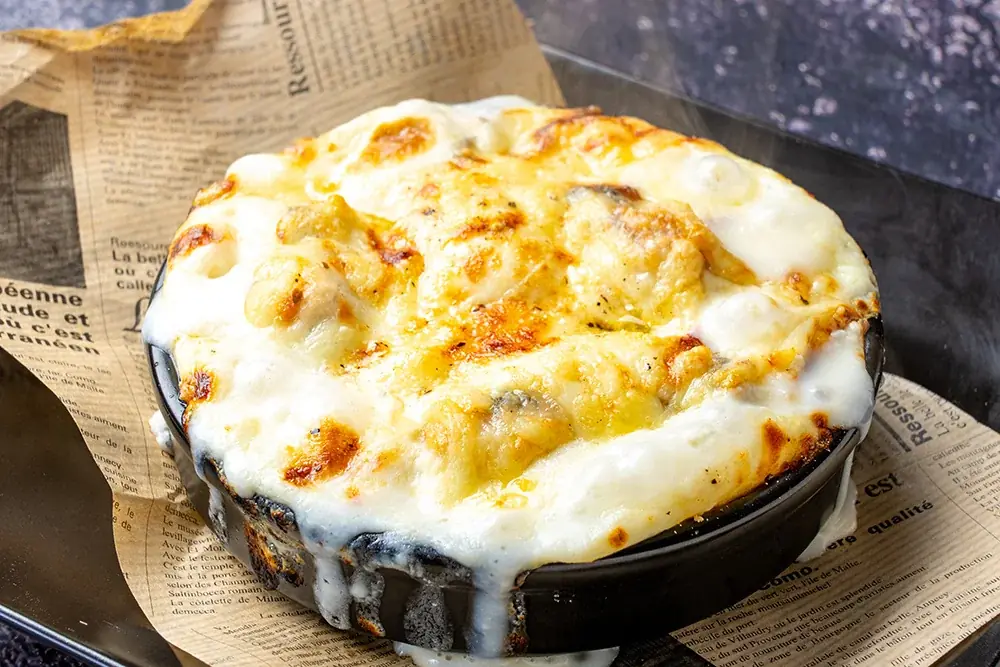 熱による仕上げが重要なメニューで、提供の際にはグラタン皿での熱々感を重視した提供が想定されています。