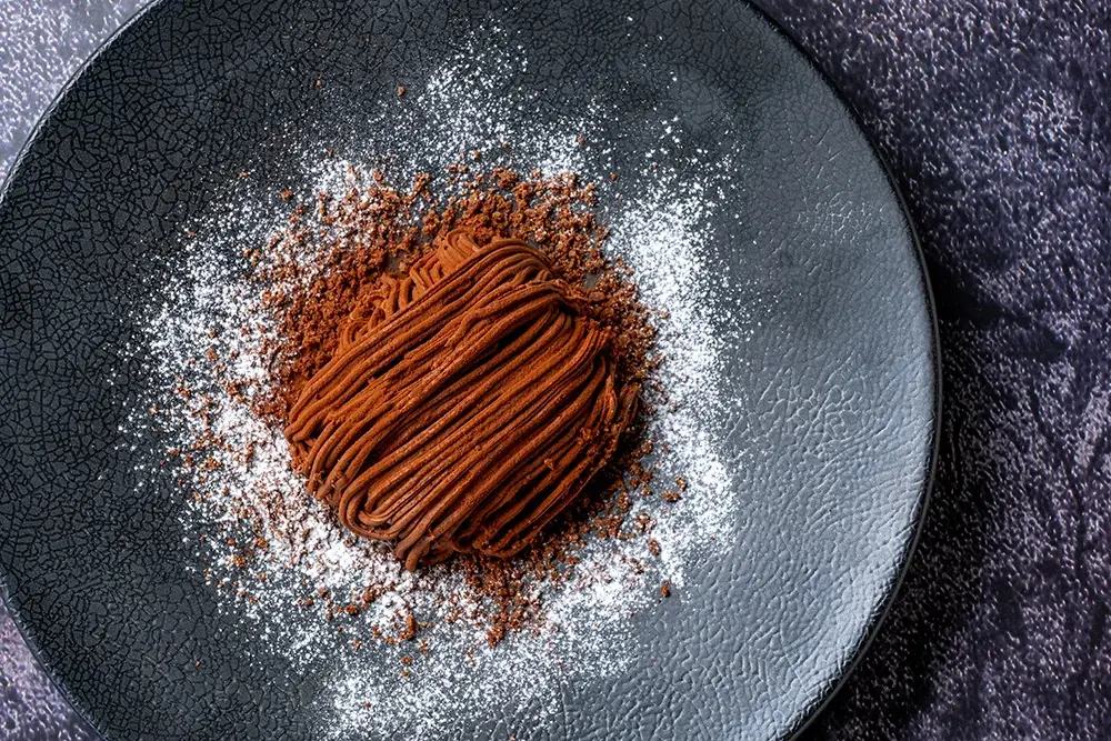 クーベルチュールチョコレートのカカオバターの風味を活かした生チョコを用い、モンブラン仕立てにしたティラミスです。デザートの中でも、チョコレートとチーズ(マスカルポーネなど)を組み合わせたリッチな構成になっています。