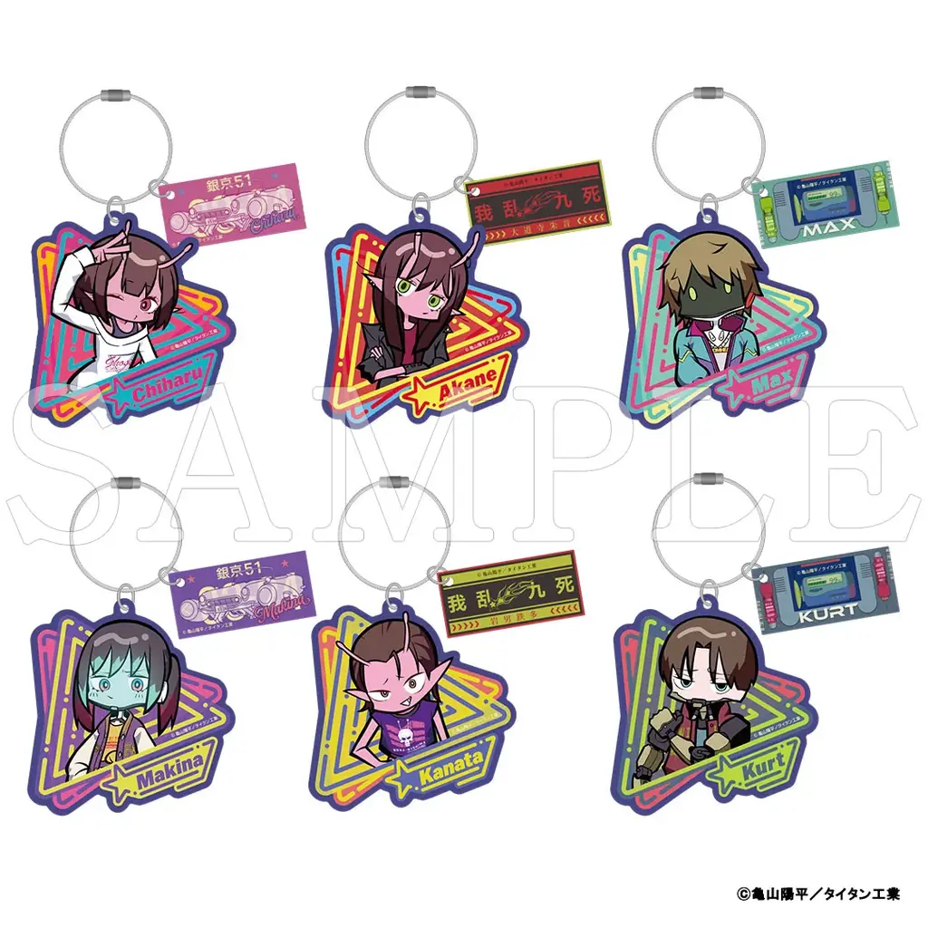 2連アクリルキーホルダー:キャラクターの描き起こしイラストと個性的なデザインパーツがセットになったキーホルダー。カバンや小物に付ける用途を想定している。