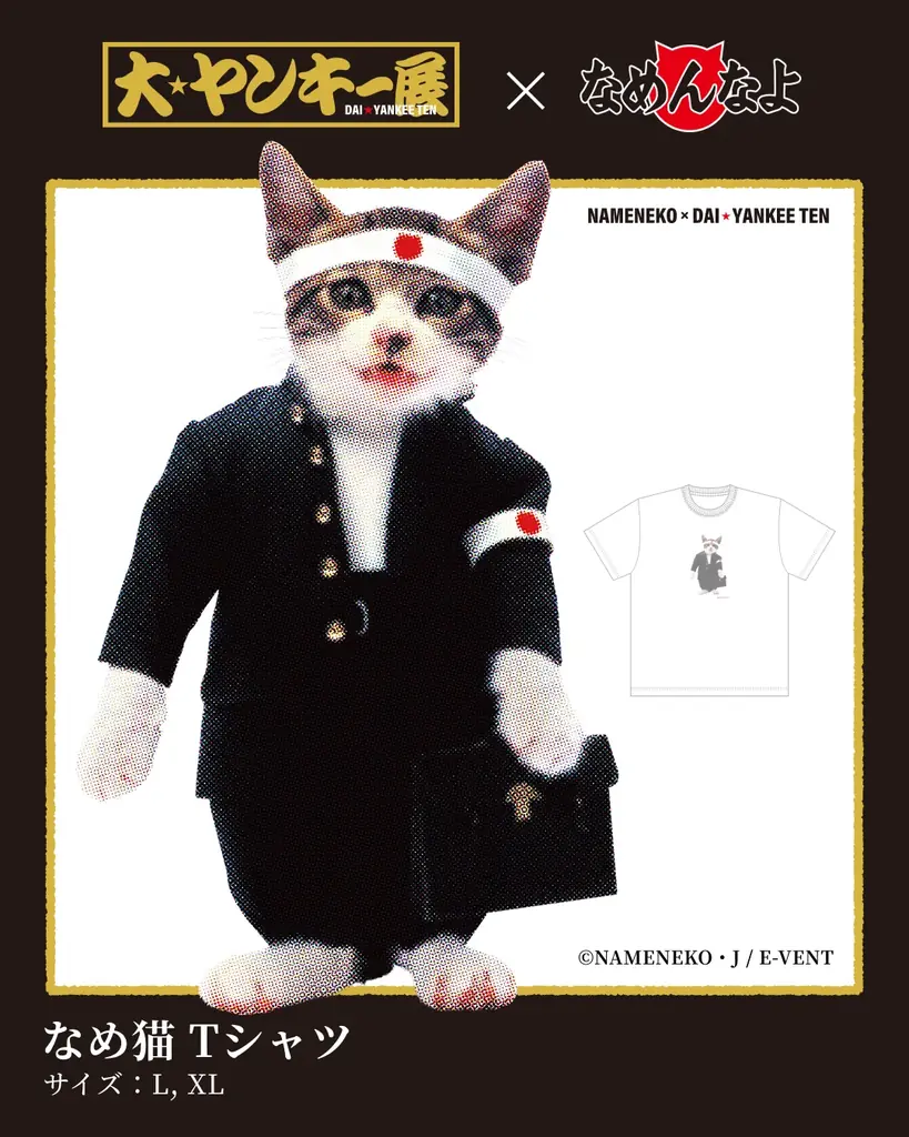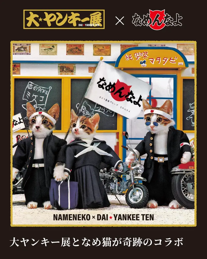 『なめ猫』のコラボは、1980年代のブームを起点に昭和ヤンキーカルチャーの“原点”を見直すものです。会場には人間大パネル(人間大のなめ猫フォトパネル)を展示し、当時のレトロな世界観を現在のヤンキー展示と並べて提示します。
