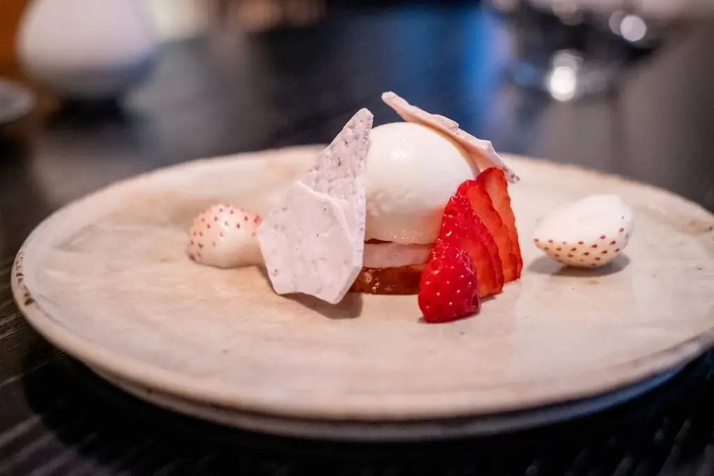 | 苺のパブロバ、クリームライン牛乳のソルベ | 1,600円 | 渋田いちご園のいちご、クリームライン牛乳 |