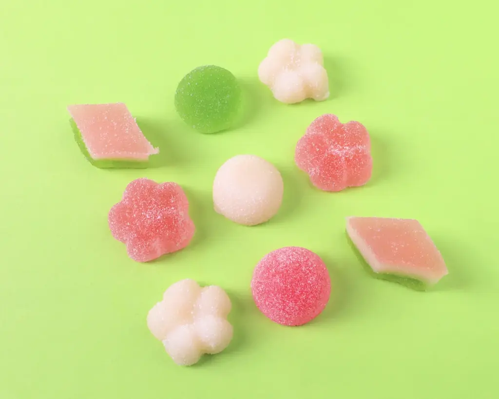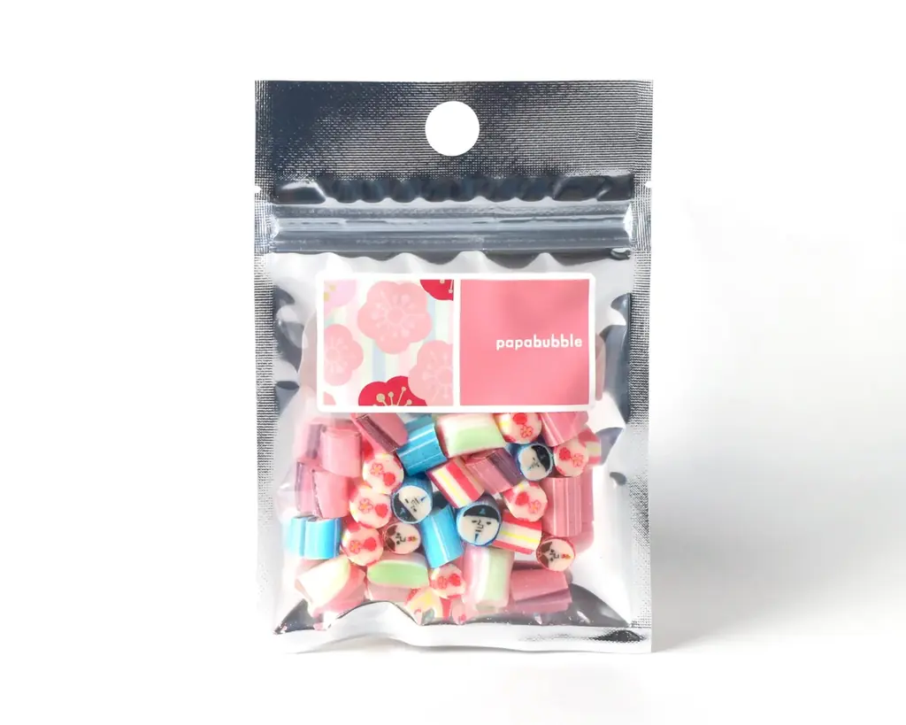 桃の花は1粒の中に白とピンクの2種を同時に配した構成で、キャンディ全体の華やかさと可愛らしさを引き出しています。視覚的な魅力だけでなく、キャンディ自体の質感や色の重なりを活かした仕上げがされている点も注目に値します。