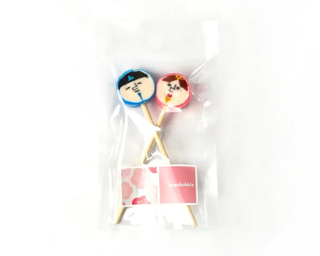 キャンディのラインナップには、棒付きキャンディとしてお内裏様とお雛様をセットにした商品が含まれます。写真撮影の小道具やひな祭りの演出アイテムとしての利用も想定し、見た目の完成度を高めたセットです。