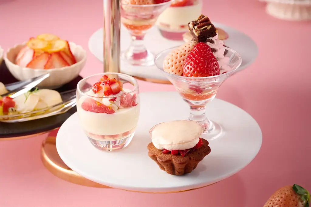 フレッシュフルーツとして、埼玉県産のブランドいちご「あまりん」と、佐賀県産の白いちご「淡雪」がそのまま提供されます。どちらも稀少性と味わいを兼ね備えた品種で、アフタヌーンティーの重要な構成要素です。