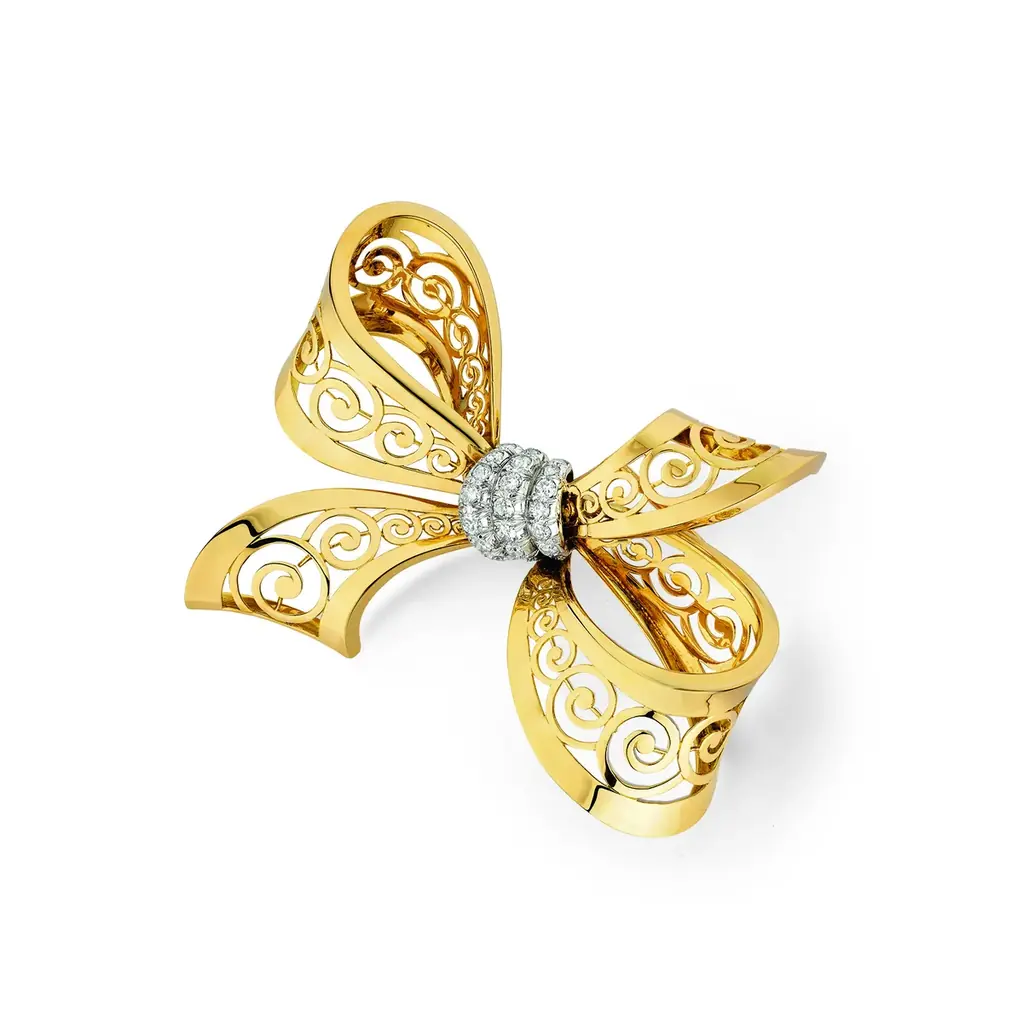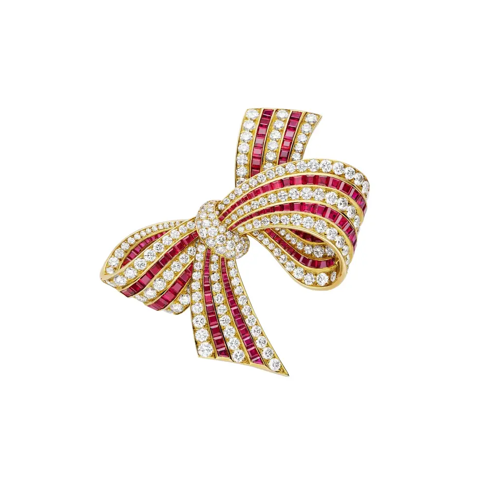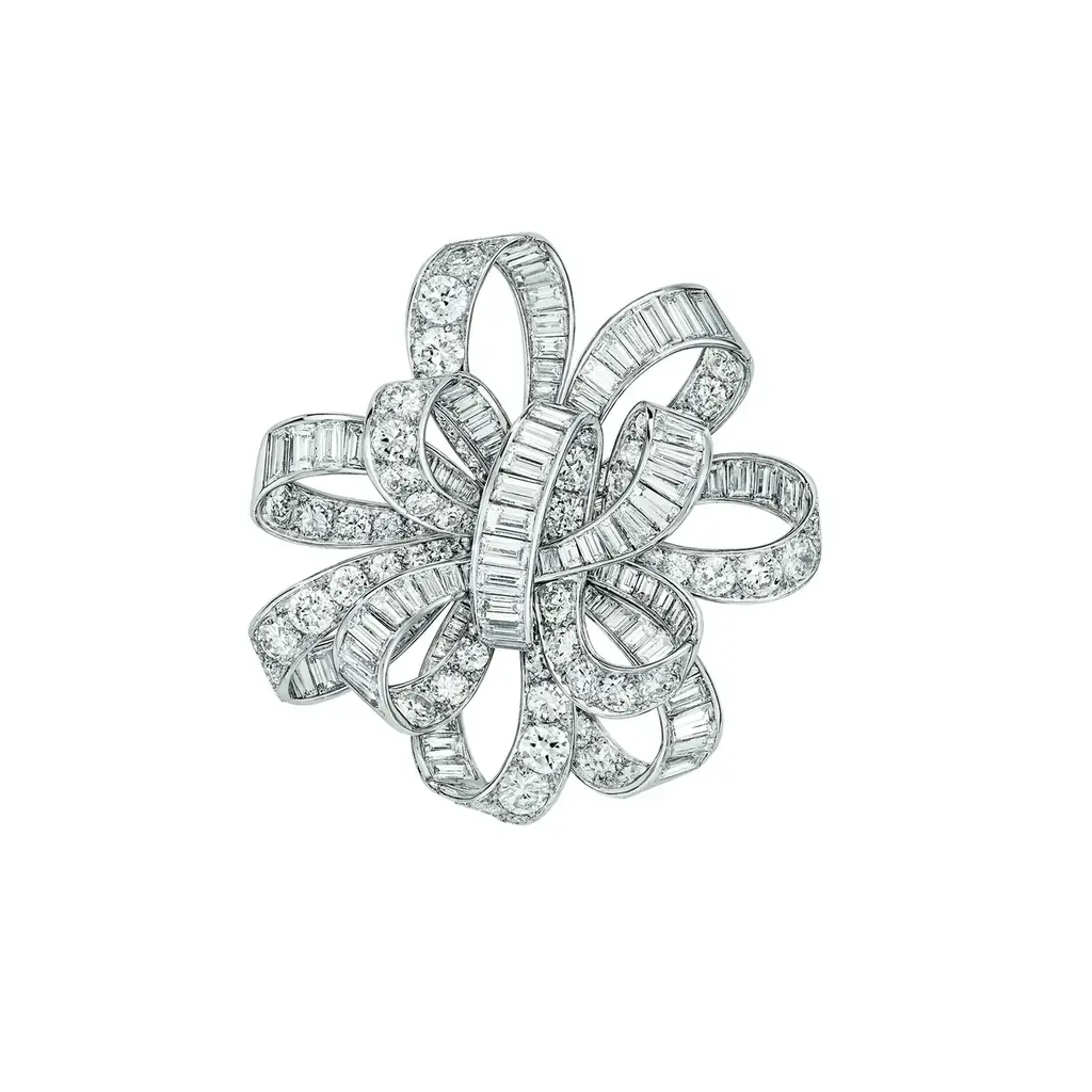 過去の代表例として、フローティング リボン ブローチ(1937年、プラチナ・ダイヤモンド)、ボウ ブローチ(1945年、イエローゴールド・プラチナ・ダイヤモンド)、レース ボウ クリップ(1949年、プラチナ・イエローゴールド・ダイヤモンド)、ストライプ ボウ クリップ(1988年、イエローゴールド・ルビー・ダイヤモンド)などが挙げられます。これらはクチュールの装飾性をジュエリーに写し取る試みの歴史を示しています。