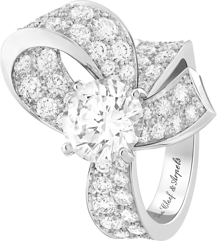 ブークル ソリティアはプラチナ製で、センターストーンはラウンドカットのダイヤモンド1石(3カラット)を配し、その他に多数のパヴェ ダイヤモンドが用いられています。リボンのモチーフは、まさに結んだばかりの布地を思わせる造形で、曲線とねじれが指元を包み込みます。