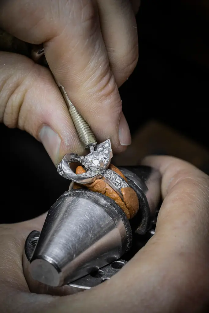 中央のダイヤモンドをセットする台枠は個別に制作されます。職人は石を精査し、ガードル直下の最も太い部分に目立たない形でゴールドのバンドを彫り上げ、そのバンドで石を固定します。この構造により、石は台枠より高い位置に置かれ、視覚的にも物理的にも輝きが引き出されます。