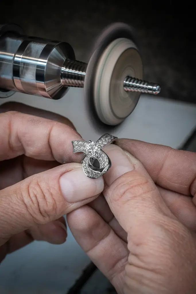メゾンのアトリエでは、ゴールドの彫成、ブラシ研磨、セッティングといった一連の工程を通じて作品に命が吹き込まれます。職人によって台座の曲線を石に合わせて調整し、研磨職人がブラシや研磨糸を用いて貴金属の輝きを引き出します。